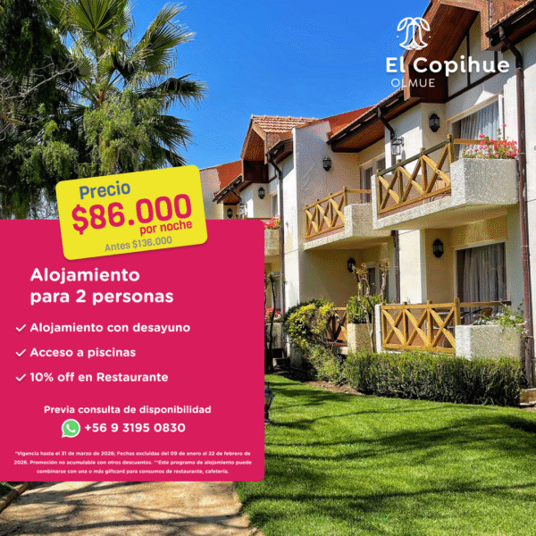 • Valor por noche para dos personas Antes $136.000.-, últimos días a solo $86.000.-