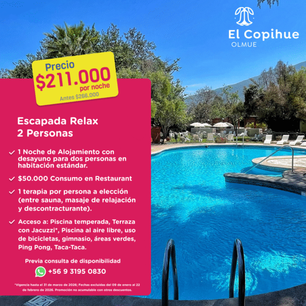 - Valor por noche para dos personas Antes $266.000.-, Oferta cyber a solo $211.000.-